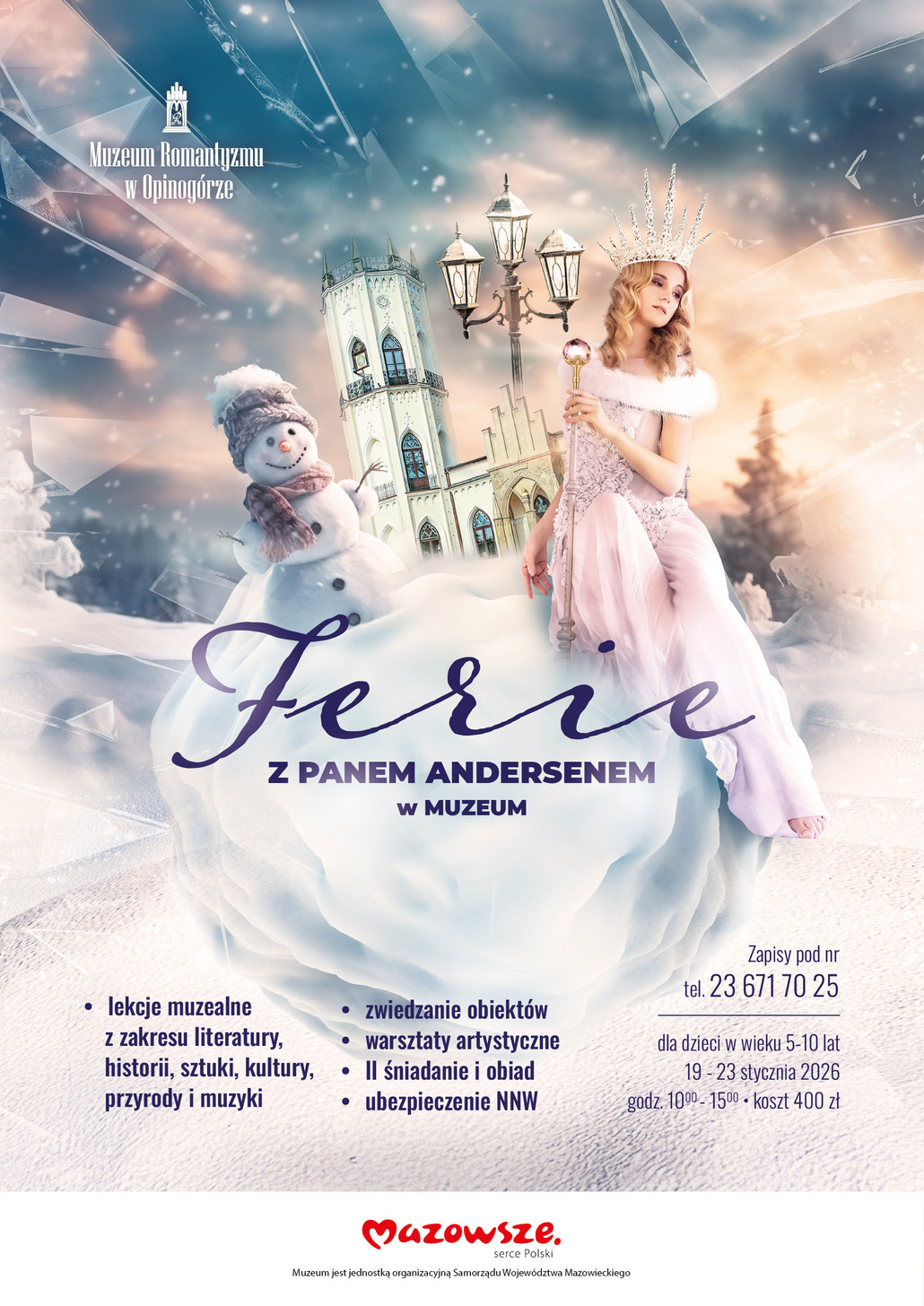 Muzeum Romantyzmu w Opinogórze zaprasza na baśniowe ferie z panem Andersenem. Podczas lekcji muzealnych dzieci w wieku 5-10 lat poznają tajniki obiektów muzealnych, a dzięki warsztatom twórczym i zajęciom muzycznym w przystępny sposób poznają historię, sztukę i kulturę. Półkolonie odbędą się od 19 do 23 stycznia, w godz. 10-15. Obowiązują zapisy. https://muzeumromantyzmu.pl