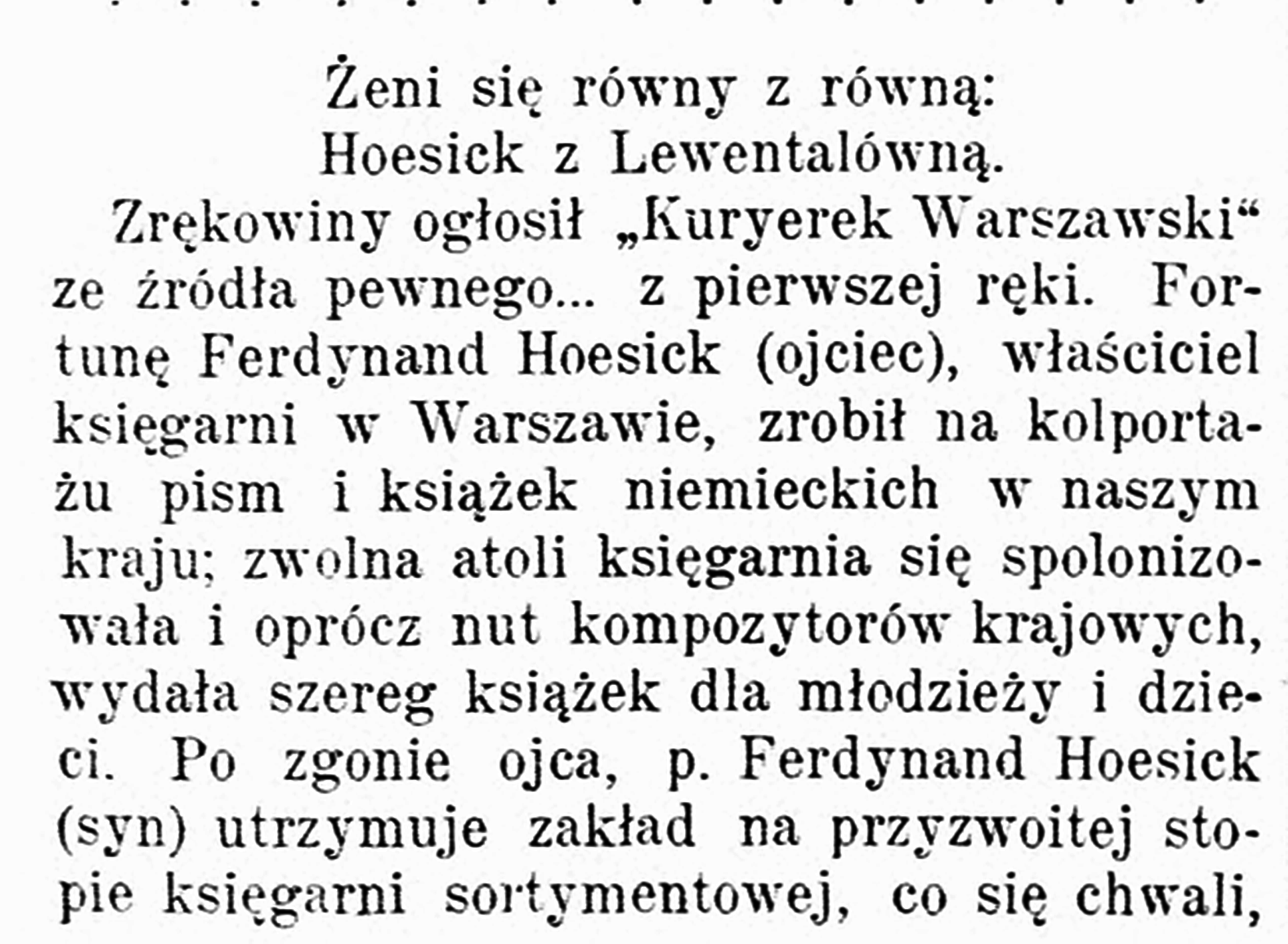 „W dowód wielkiego uznania dla działalności pisarskiej Ferdynanda Hoesicka, Alicja Mińska spadkobierczyni fortuny po ojcu Franciszku Lewentalu, wydawcy i księgarzowi warszawskiemu, przekazuje wsparcie pieniężne”.