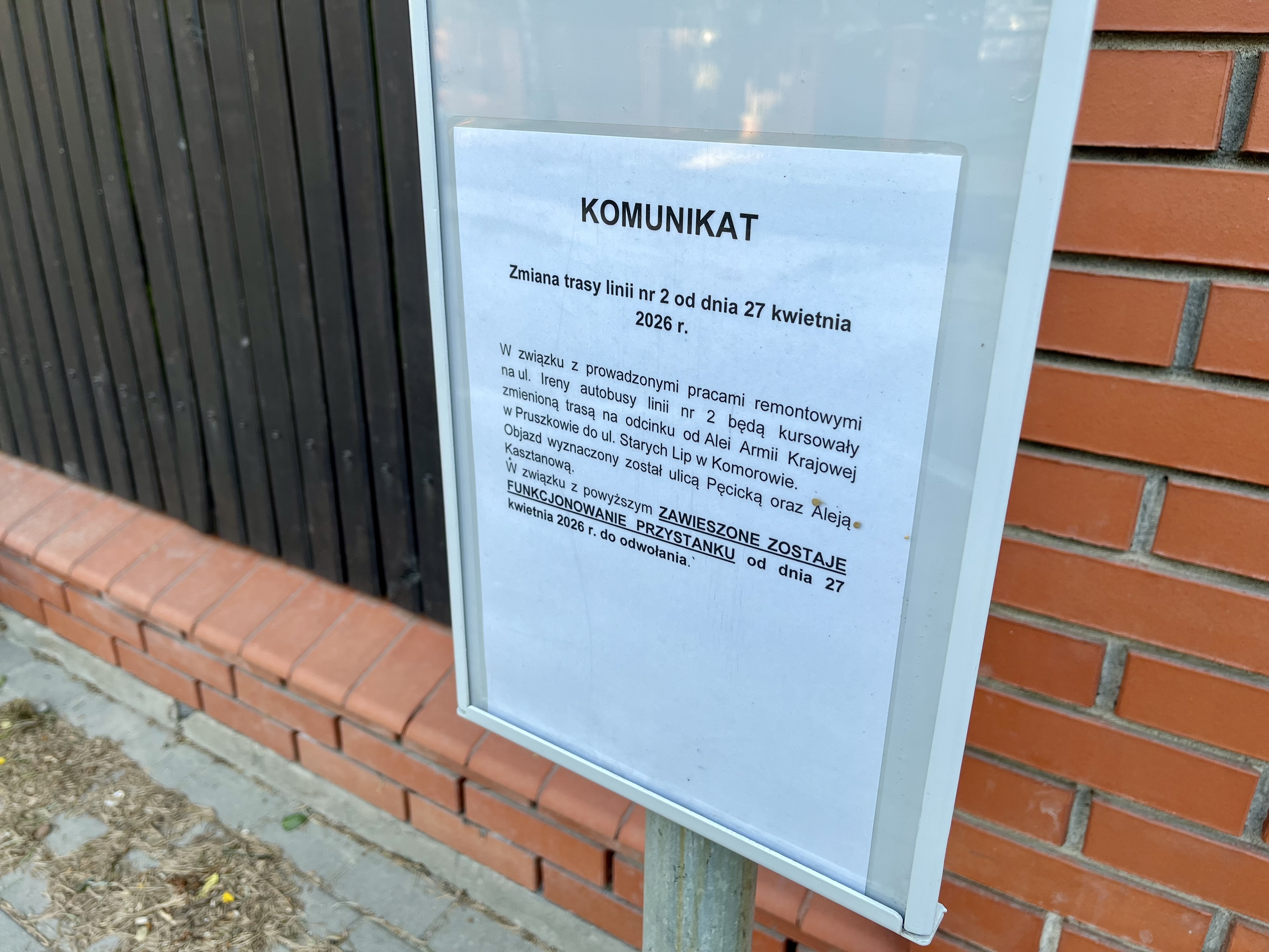 Główną wiadomością dla podróżujących między Pruszkowem a Komorowem jest zmiana przebiegu trasy linii nr 2 na odcinku od Alei Armii Krajowej do ulicy Starych Lip. Zmiany te wchodzą w życie 27 kwietnia i będą obowiązywać aż do odwołania. To efekt konieczności ominięcia placu budowy, który uniemożliwia przejazd standardową drogą.