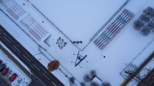 Obecny stadion Pogoni Grodzisk zimą. Tak dziś wyglądają maszty oświetleniowe [GALERIA ZDJĘĆ]