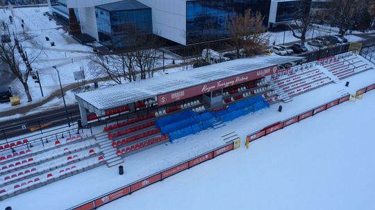 Obecny stadion Pogoni Grodzisk zimą. Tak dziś wyglądają maszty oświetleniowe [GALERIA ZDJĘĆ]